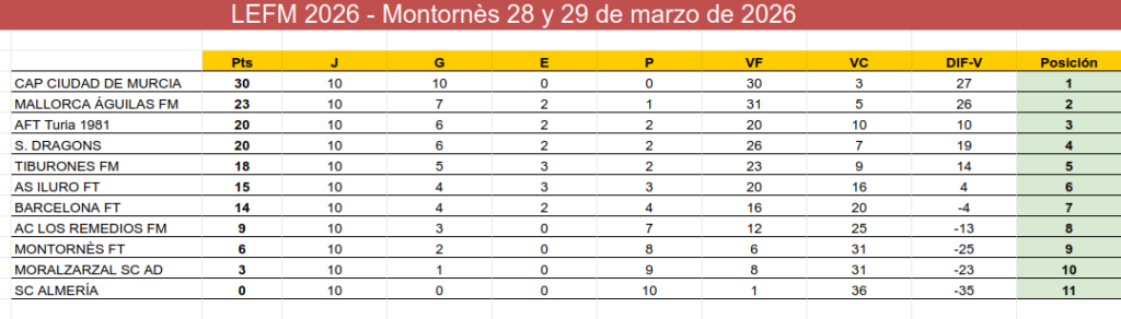La bona actuació de Montornès també ha tingut una conseqüència directa fora de la classificació de la LEFM. Amb aquest resultat, l’AS Iluro FT puja fins a una sòlida sisena posició del rànquing espanyol de l’AEFM, una plaça de gran valor competitiu i simbòlic.